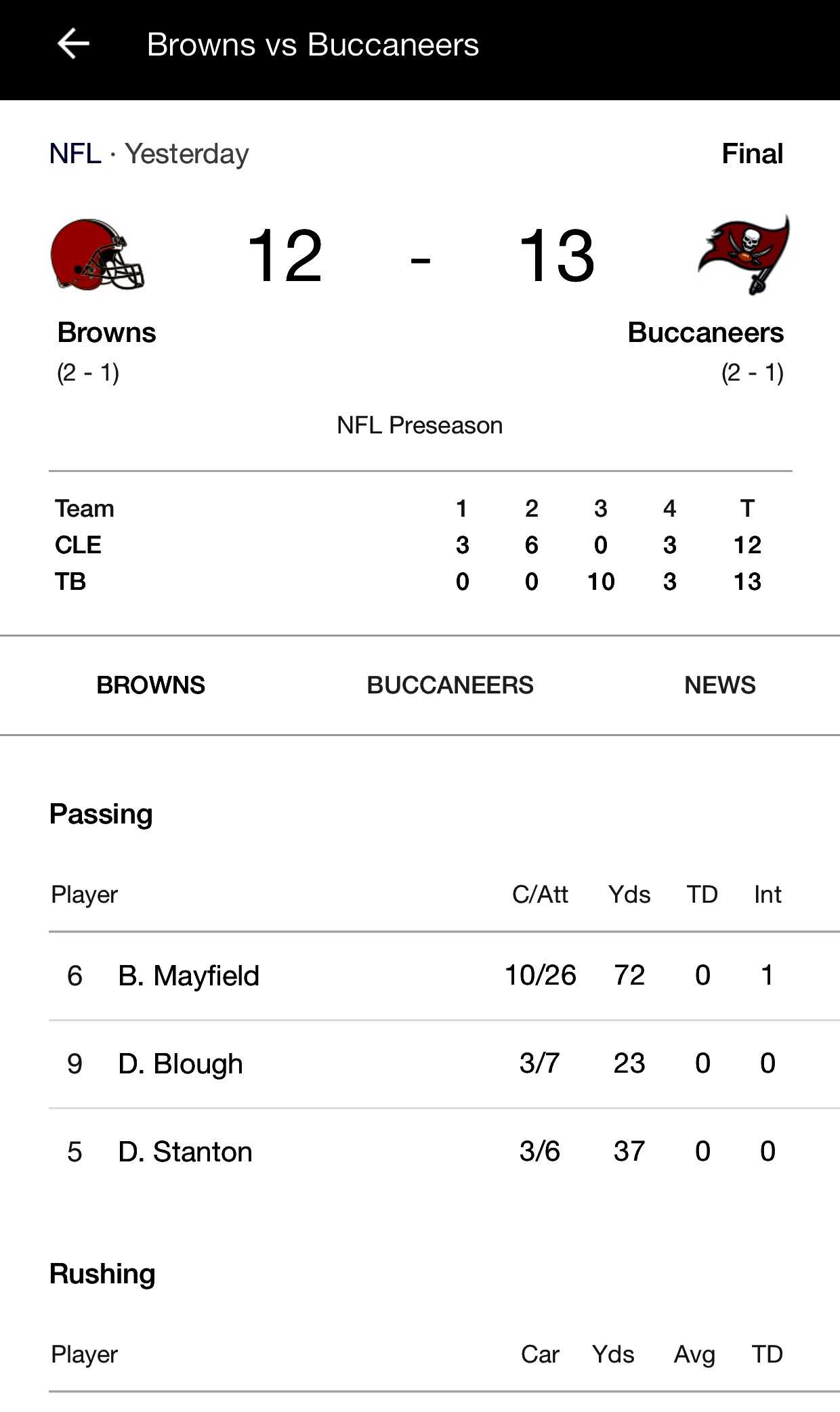 Written by EARNED (LETS TALK SPORTS)August 24, 2019 Browns struggled this week against the bucks but still no Concerns yet. Baker struggled and gave up ate only turnover Share this: Click to share on X (Opens in new window) X Click to share on Facebook (Opens in new window) Facebook Like Loading... Related Leave a comment Cancel reply Δ