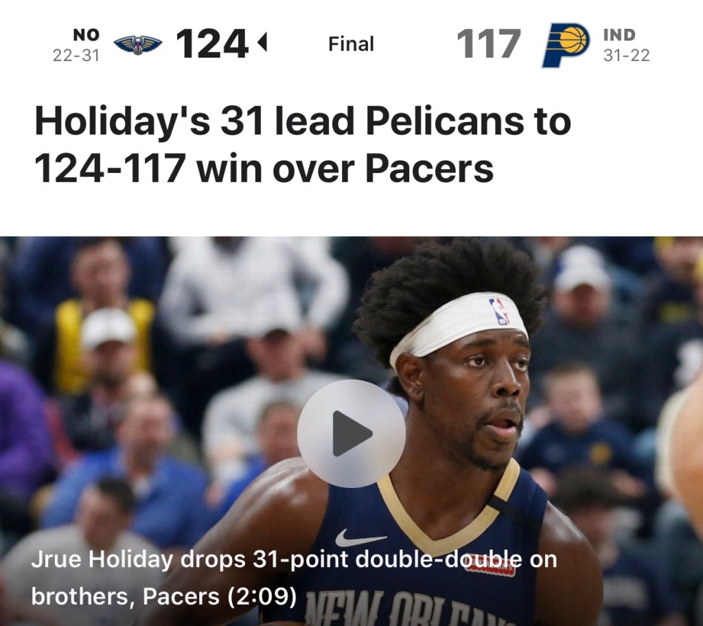 Written by EARNED (LETS TALK SPORTS)February 9, 2020 Tonight’s WALKING BUCKET of the night goes to Jrue Holiday 31pts 10assists 6rebounds I don’t own rights to this photo Share this: Share on X (Opens in new window) X Share on Facebook (Opens in new window) Facebook Like Loading... Related Leave a comment Cancel reply Δ