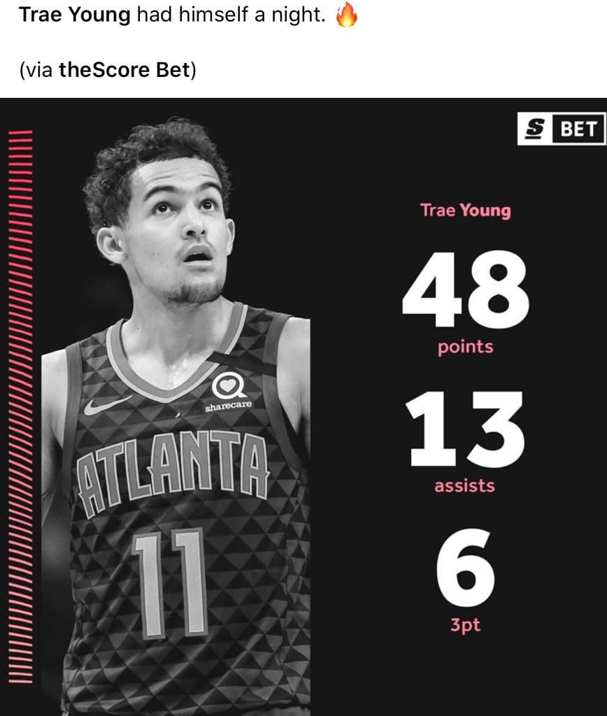 Written by EARNED (LETS TALK SPORTS)February 10, 2020February 10, 2020 Day 4 of the WALKING BUCKET OF THE NIGHT and it goes to my guy from the Atlanta Hawks Trae Young I don’t own rights to this photo Share this: Share on X (Opens in new window) X Share on Facebook (Opens in new window) Facebook Like Loading... Related Leave a comment Cancel reply Δ
