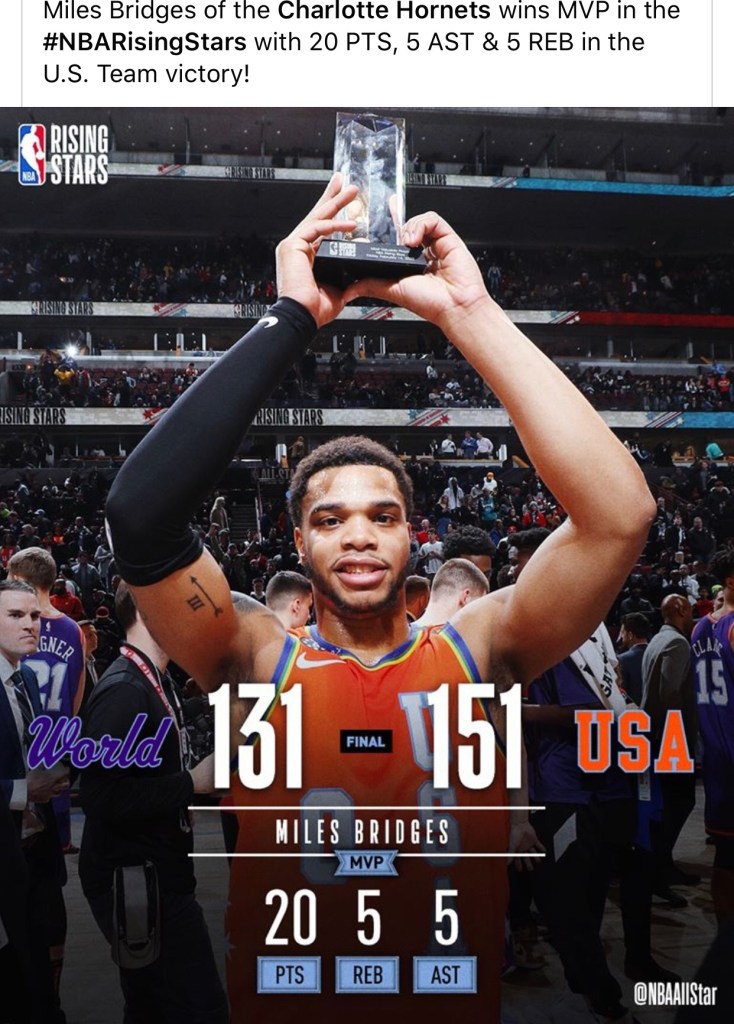 Written by EARNED (LETS TALK SPORTS)February 15, 2020 NBA All Star edition Rising Star WALKING BUCKET OF THE NIGHT GOES TO MILES BRIDGES I don’t own rights to this photo Share this: Share on X (Opens in new window) X Share on Facebook (Opens in new window) Facebook Like Loading... Related Leave a comment Cancel reply Δ